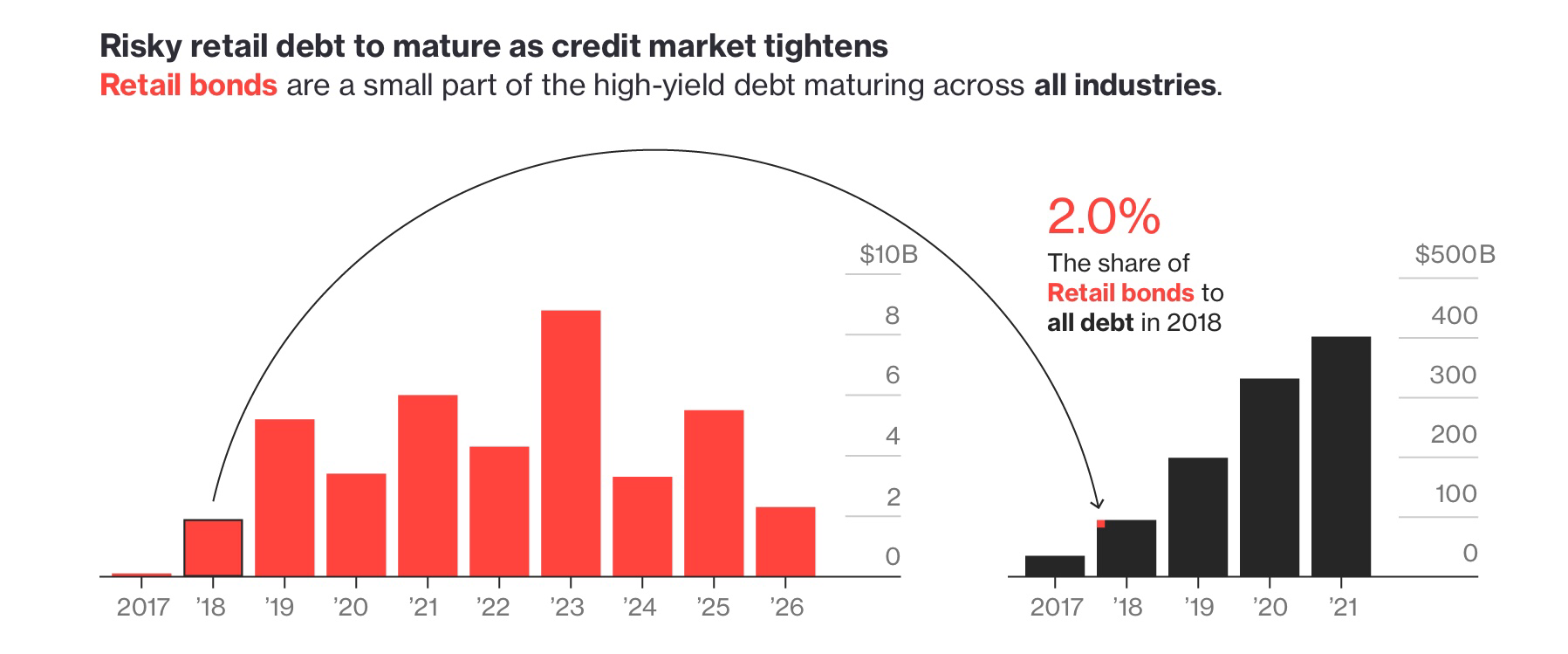 A lot of this debt falls due over the next five years. To give a sense of the scale of this, “$100 million of high-yield retail borrowings were set to mature this year, but that will increase to $1.9 billion in 2018.” And then it ratchets up again, to close to $5 billion a year between 2019 to 2025.