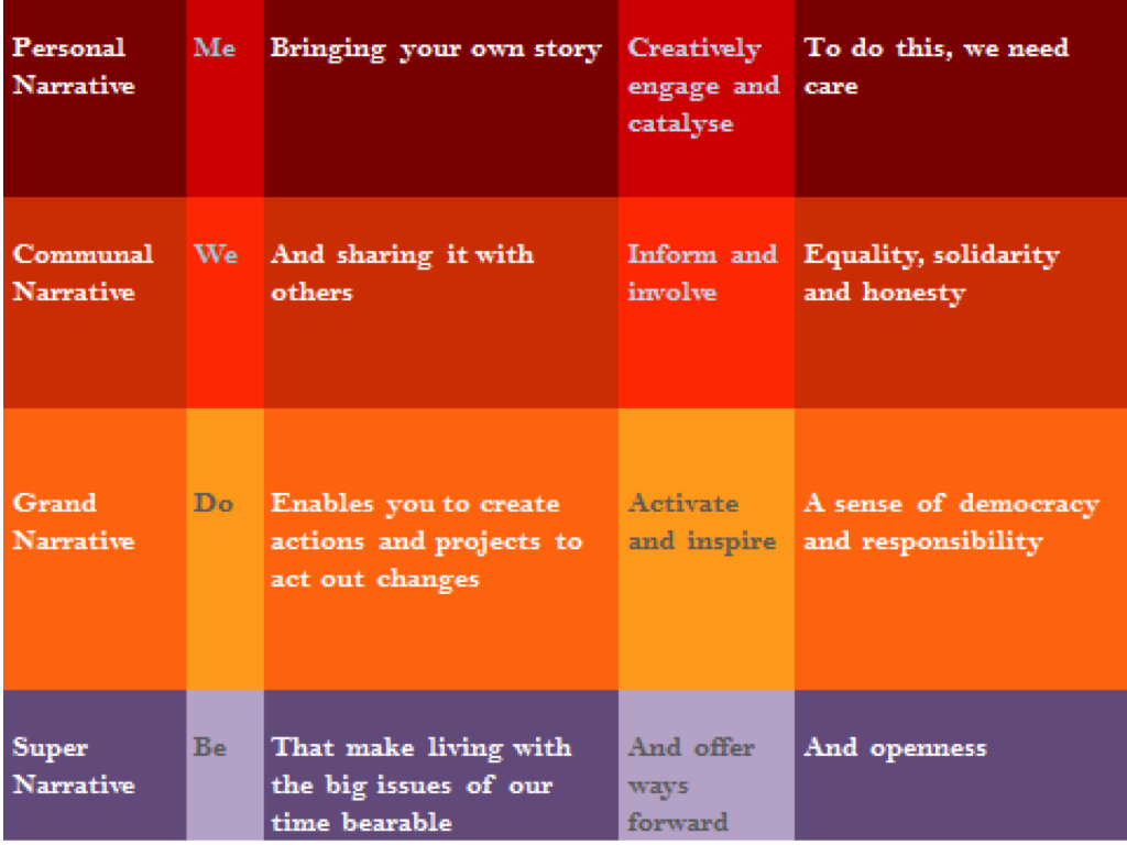 The first column shows the different levels of narrative, the second the dominant experience at each level. The third shows how story features in each, the fourth the effect of these elements on the ‘spect-actors’ (Boal’s term for the active and engaged audience), and the final column is about the values associated with each level. The point, though, is that the interaction between the levels creates the space for new meanings to emerge.