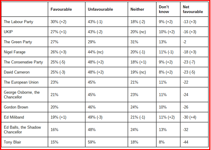 Its data for the end of September 2014 can be seen in the table below. (Some of these numbers have changed in the past six months, but not substantially). This is probably as close as political brands come to Net Promoter Scores, and no one scores positively. Labour and Conservative are both running in the negative mid-teens, and some of the ratings for individual politicians are dismal.