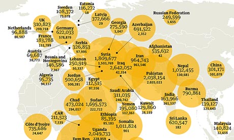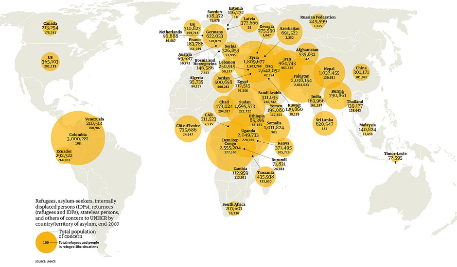 There a separate point worth picking up from the UNHCR’s 2007 report (opens in PDF). This is that, contrary to much of the coverage in the UK, most refugees don’t go far. Most are actually ‘internally displaced persons’ who have to move elsewhere in their own country. About a quarter of the world’s refugees are Afghans, and almost all of them have remained in Asia. Again, Colombia is the largest source of refugees in the Americas, and most of these are in Ecuador and Venezuala. This proximity principle explains why Pakistan, Syria, and Iran have more refugees than anywhere else (see map below, for which thanks to the Guardian).