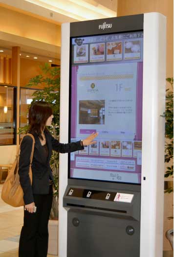 Exhibit 2 is a plasma kiosk developed by Fujitsu for Nomura Securities in Tokyo which changes function depending on what customers are doing. The UB Wall combines a touch-sensitive plasma screen, motion sensors, and RFID technology. If not in active use, it acts as a videowall; when a customer approaches, motion sensors turn off the ads and switch on a touch screen menu (cash point mode, in effect). And if the customer wants to take information with them, the Wall can send it to a suitable device (e.g. a mobile phone) using RFID and Wi-Fi.