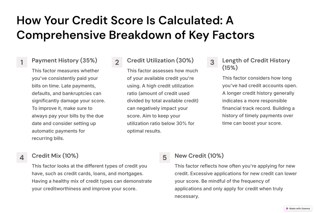 Understanding how your credit score is calculated is the first step to improving it. Here’s a breakdown of the factors that influence your score: