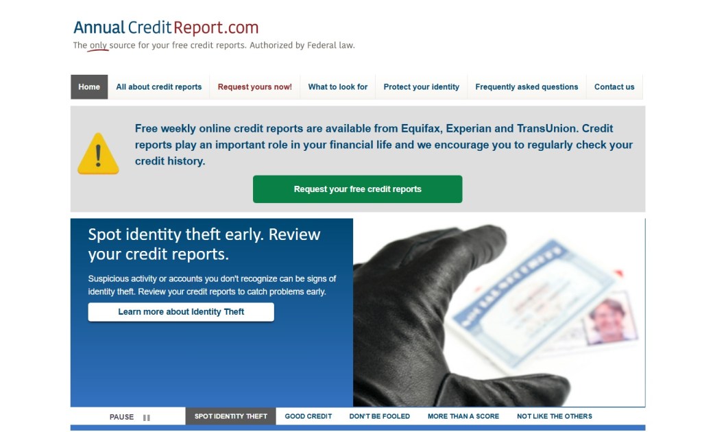 - Free Credit Reports : You’re entitled to one free credit report per year from each of the three major credit bureaus (Equifax, Experian, TransUnion) at AnnualCreditReport.com .